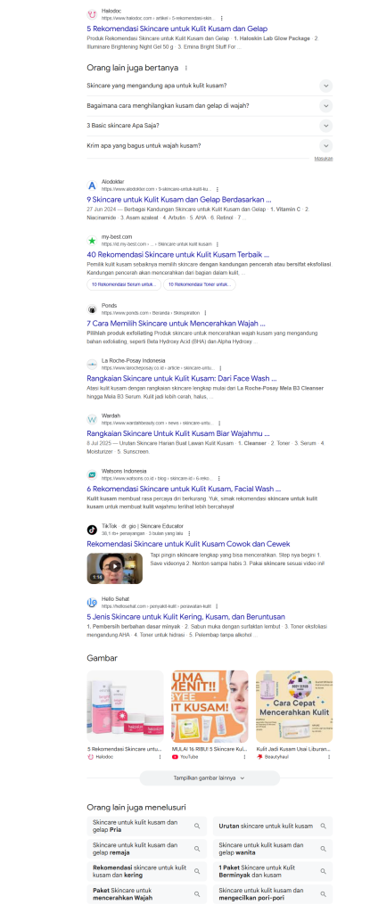 Kita akan menggunakan studi kasus berdasarkan analisis SERP yang saya lakukan sebagai contoh, dari keyword yang umum (skincare untuk kulit kusam dan gelap) hingga entitas spesifik yang mendominasi konten kompetitor.